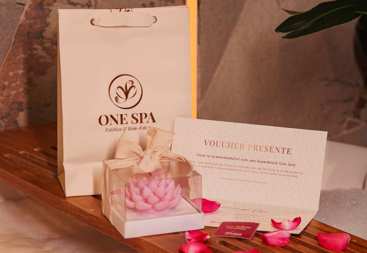 Ela é adicionada à sacola com o Voucher Presente ONESPA, trazendo um toque sofisticado e cheio de significado.